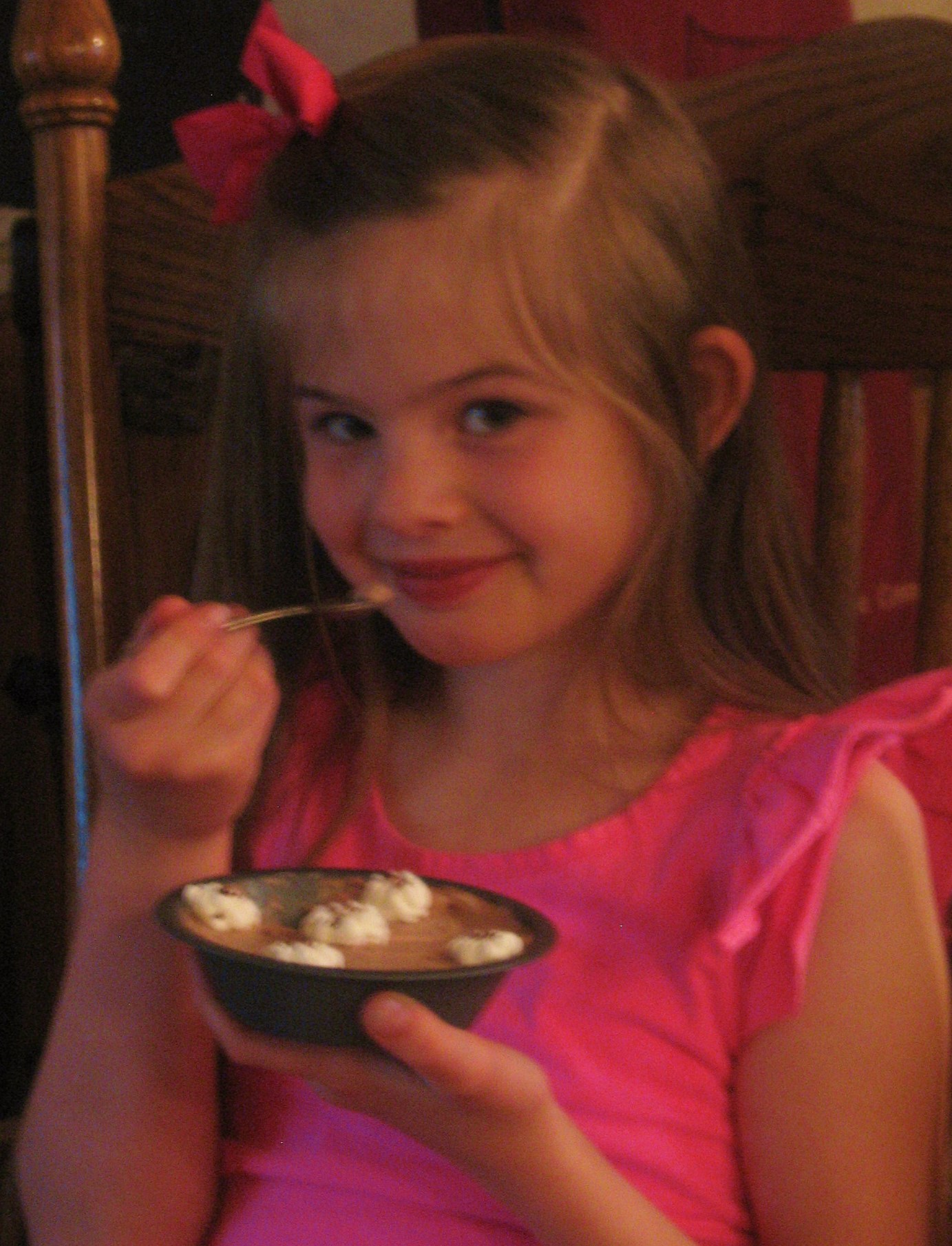 Add a glass of milk, which is cream mixed with water, yes she gets the yummy creamy stuff – add a few drops of chocolate – or any other flavor if you like.