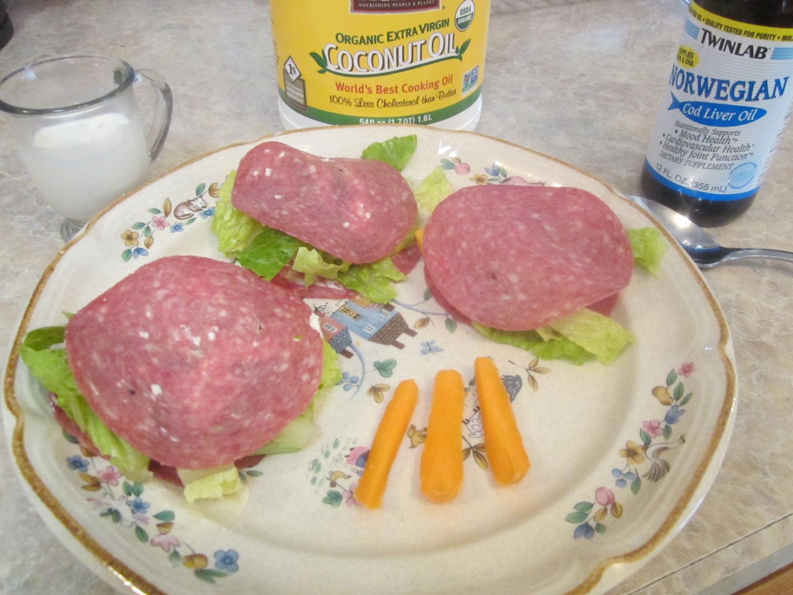 So, here you go: Salami, cheese, butter, carrots, lettuce, cream – with chocolate drops if you like, and either coconut or fish oil – oh, and a bit of mustard – it is missing from the picture, but you gotta have a bit o’mustard to with that salami. 🙂