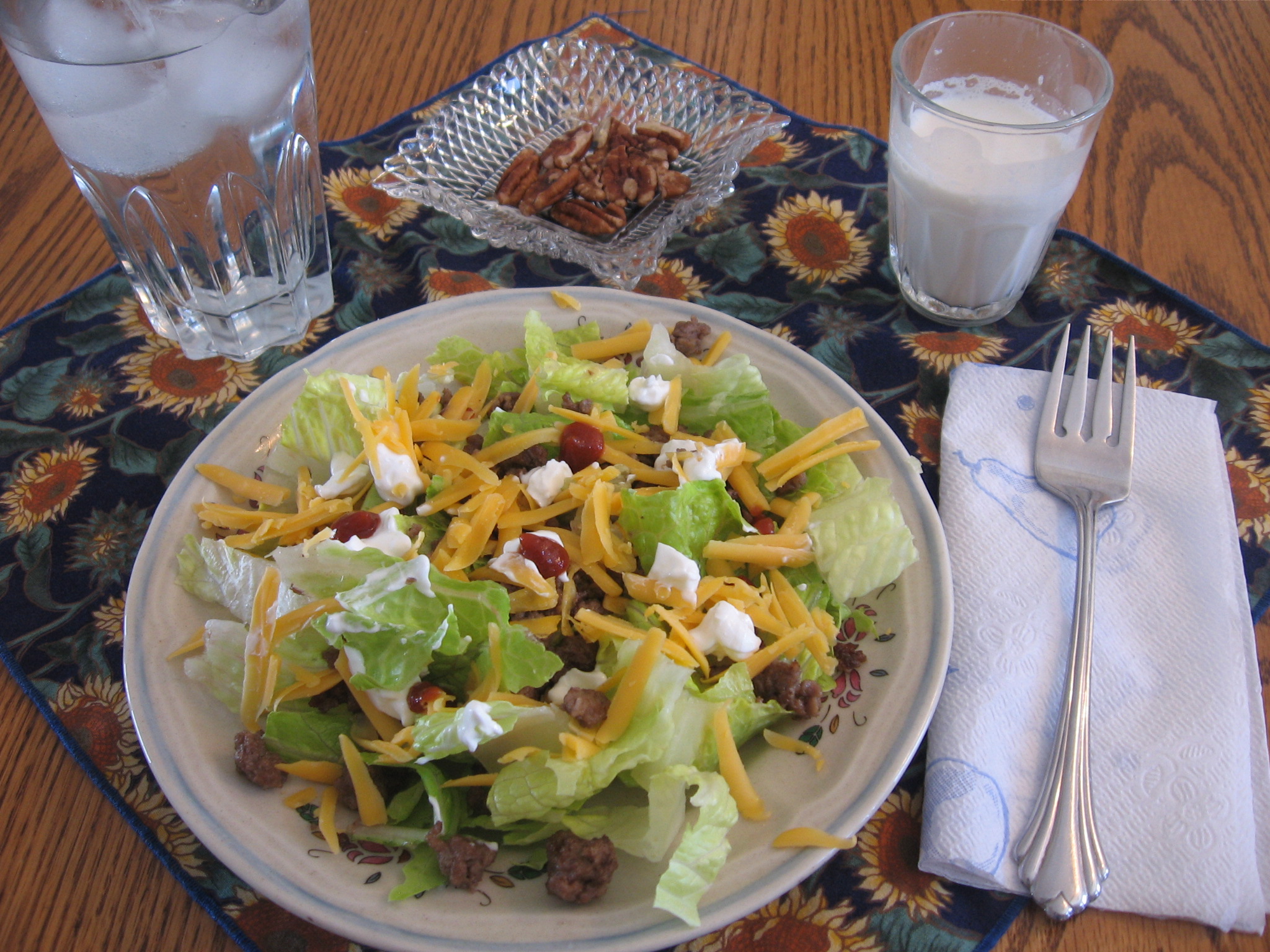 It is so basic – lettuce, hamburger, cheese, sour cream and a tad of low carb ketchup. I felt like, “Dah – why have we never done this before!” Although, I still think making taco shells out of cheese like Dawn does is a cool idea 🙂