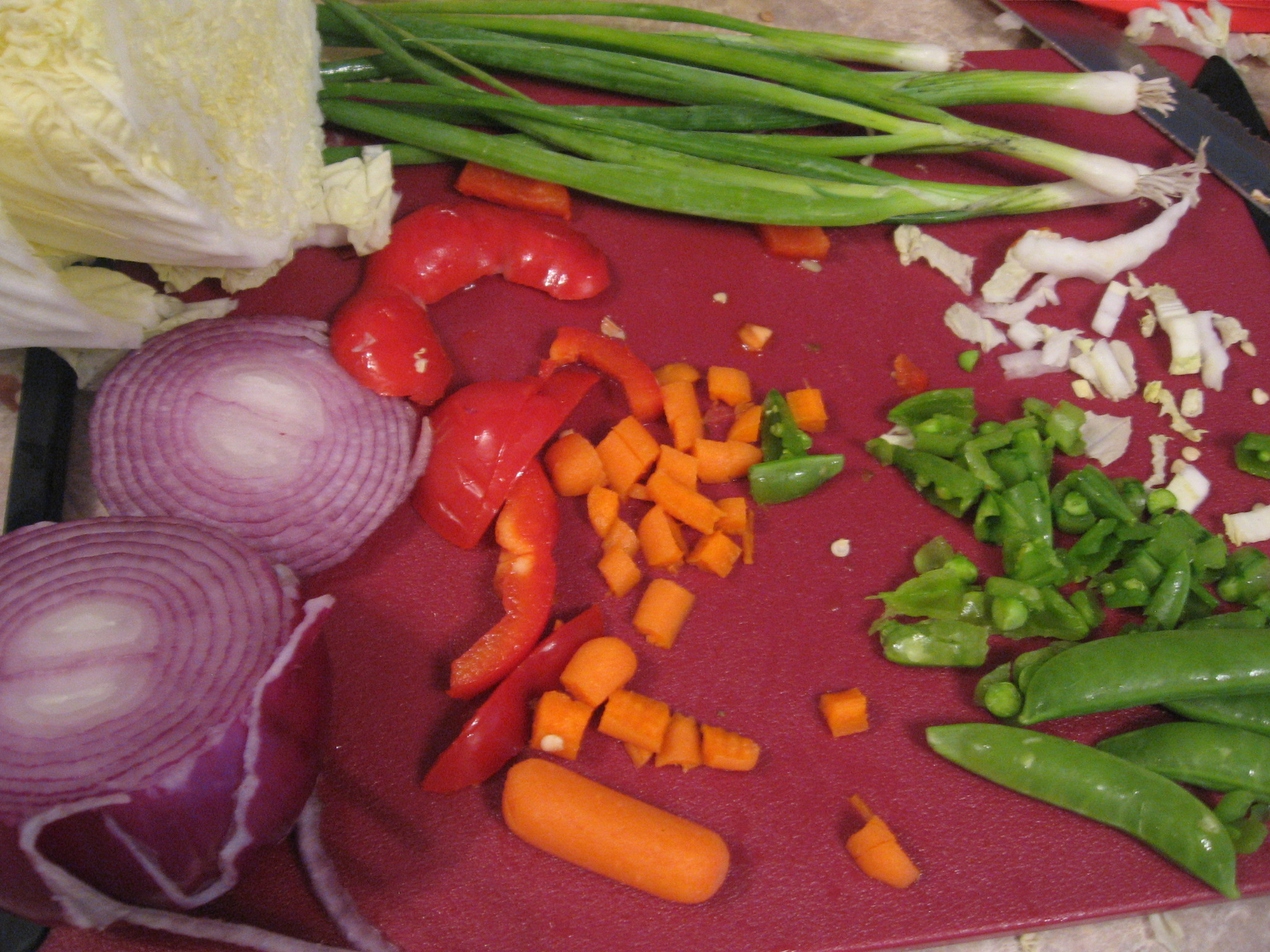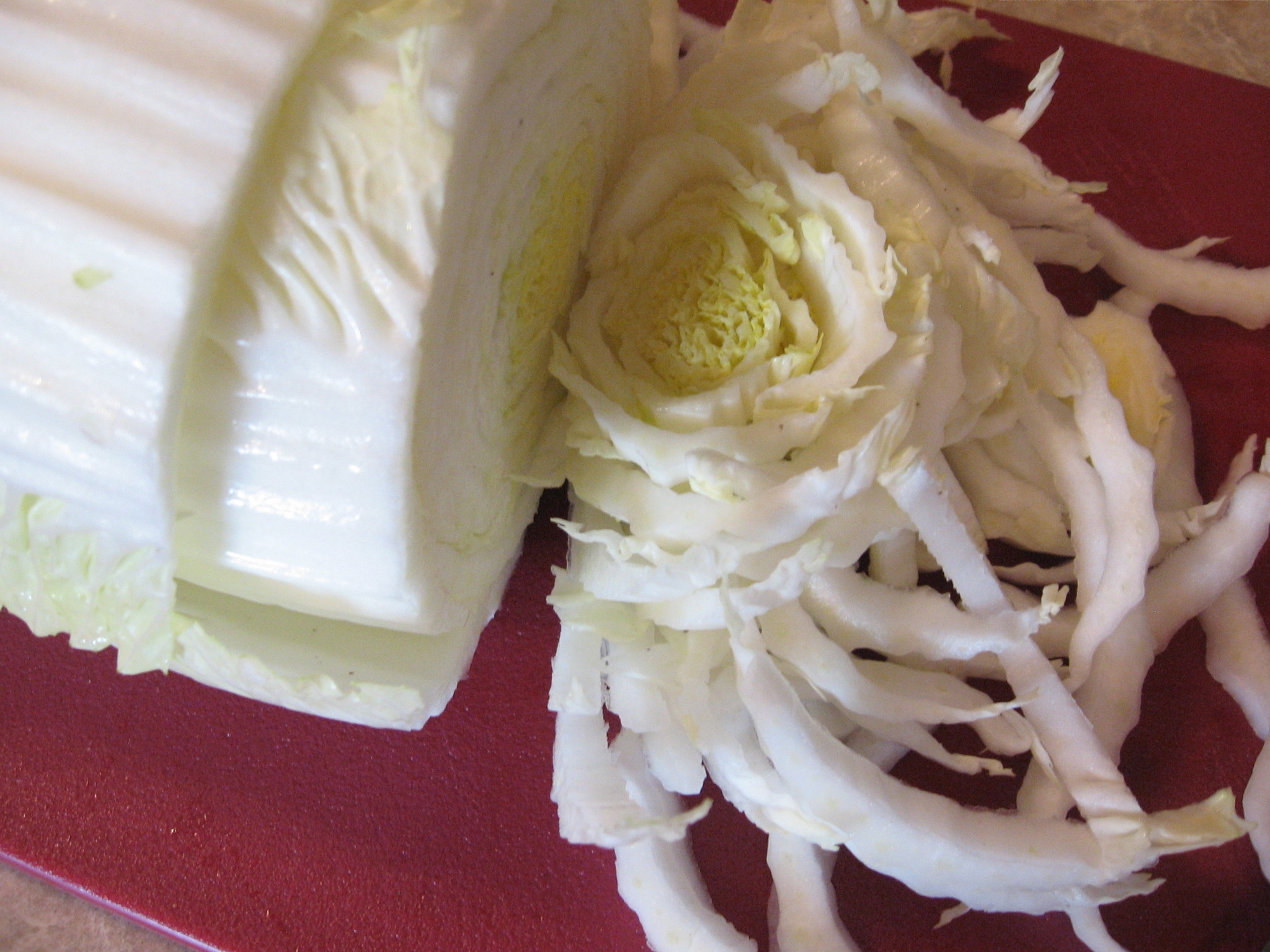 I had never bought a Napa cabbage before – it is much sweeter than regular cabbage. I took off the larger outer leaves and then cut it finely: